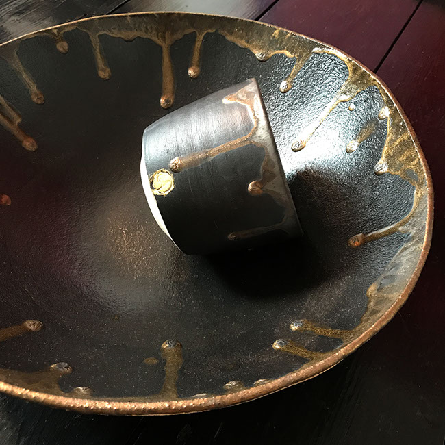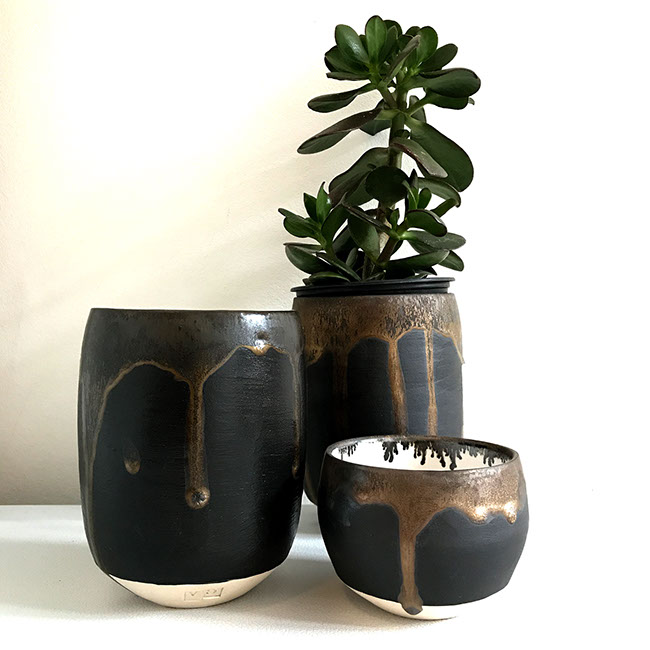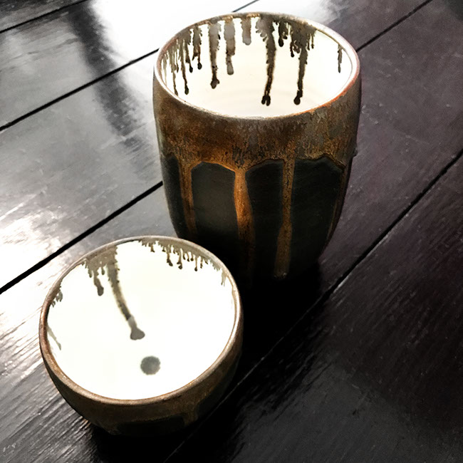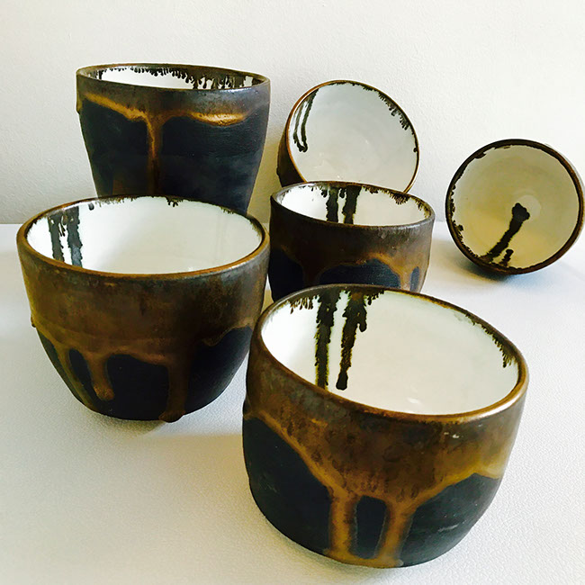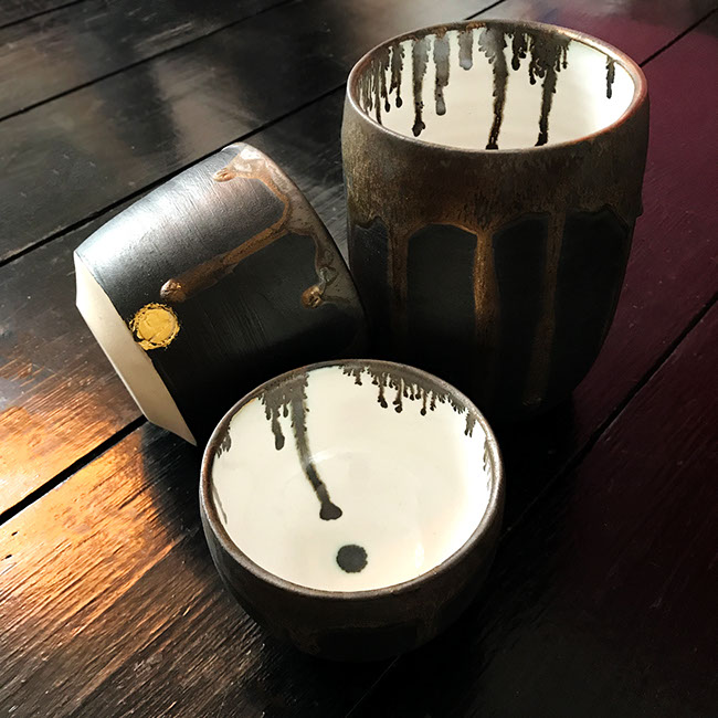 This collection includes large bowls, vases, rice bowls and tea cups. Some pieces are thrown on the wheel, some are hand-built and some are a mixture of both techniques.