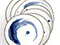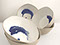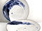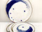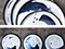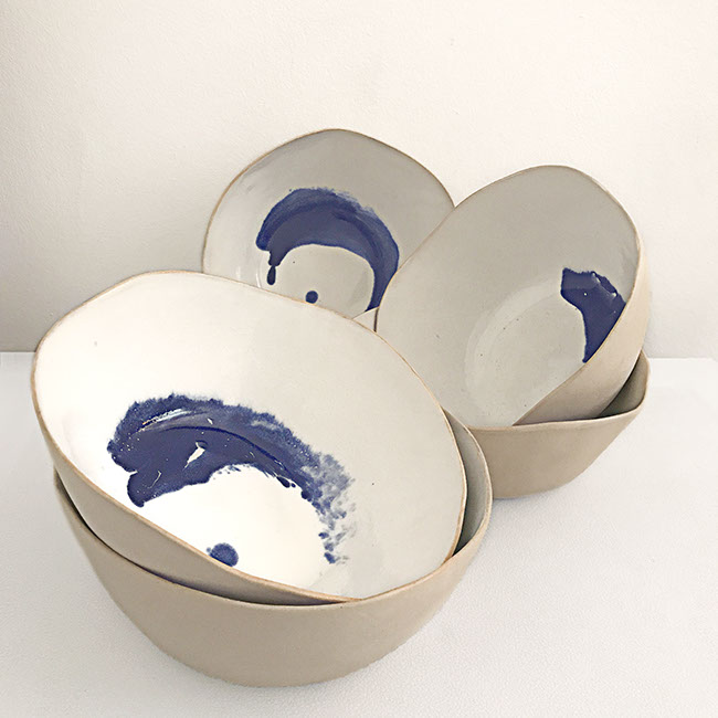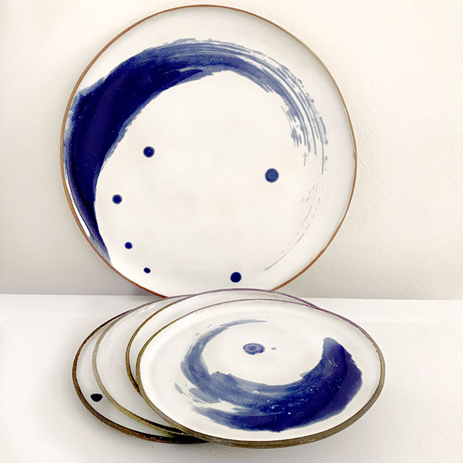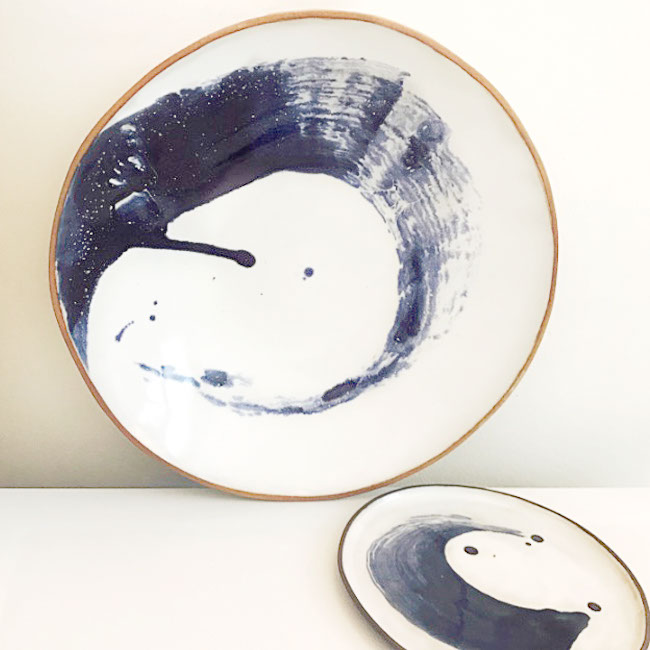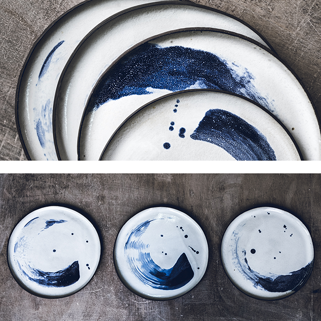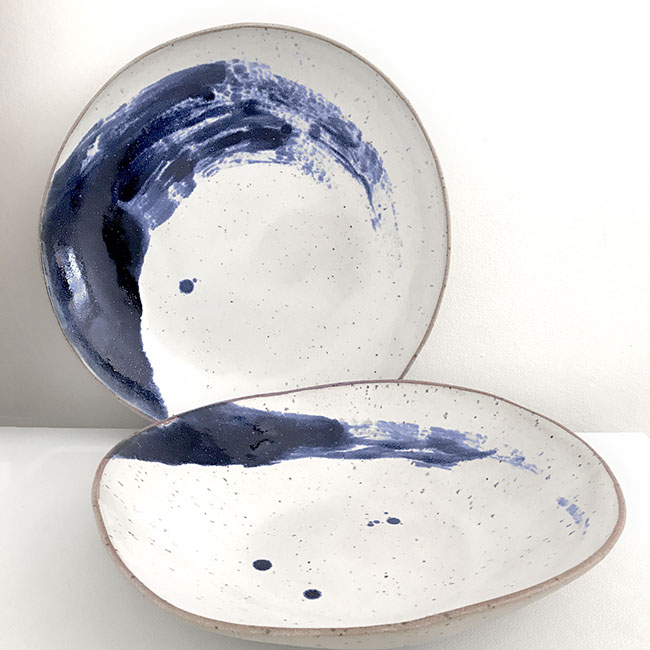 Pieces include large fruit and salad bowls, serving platters, dinner and side plates and bowls. Stoneware, dark and flecked clay are glazed with simple blue and white.