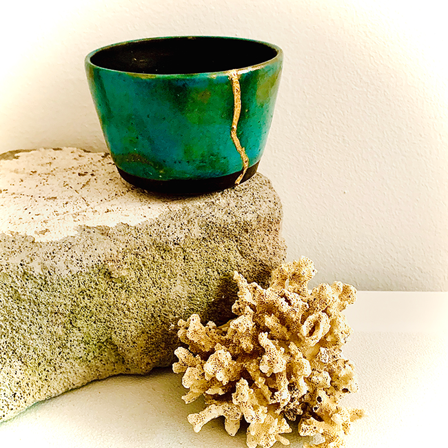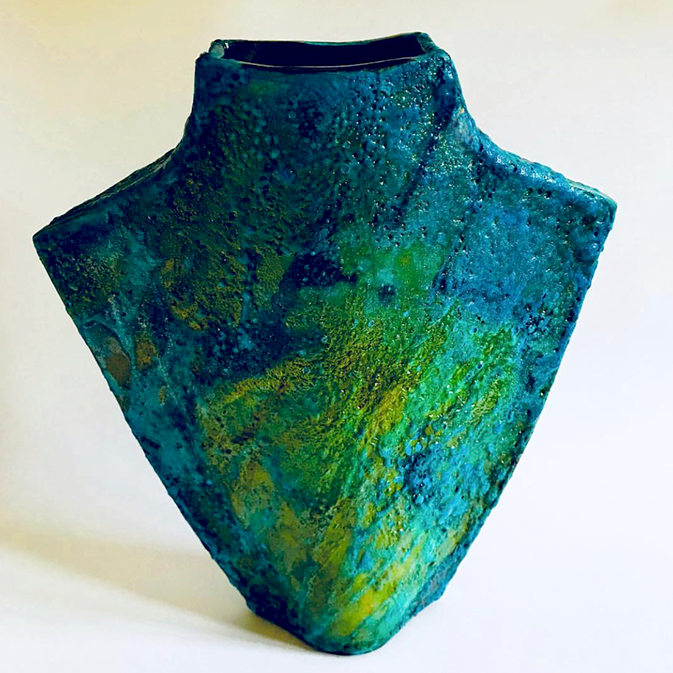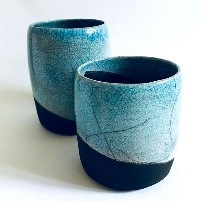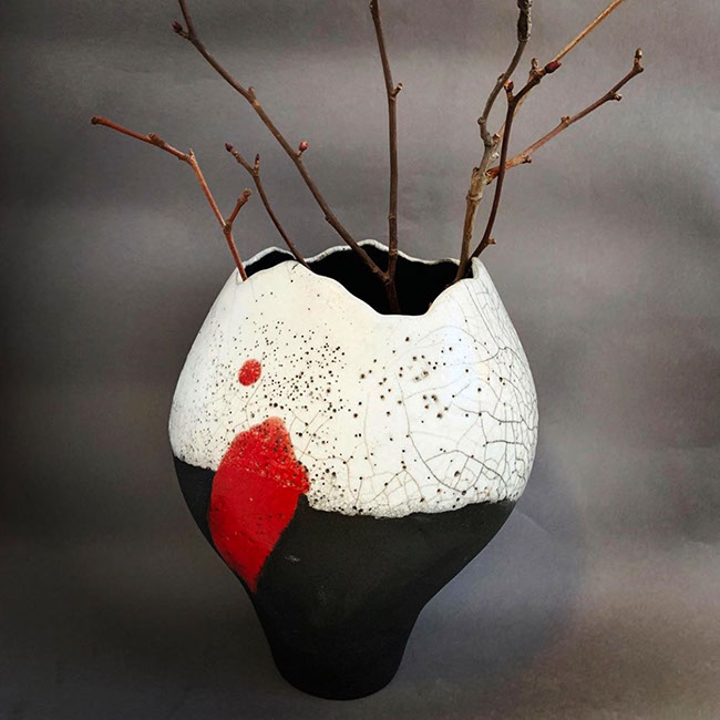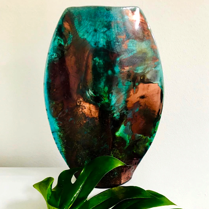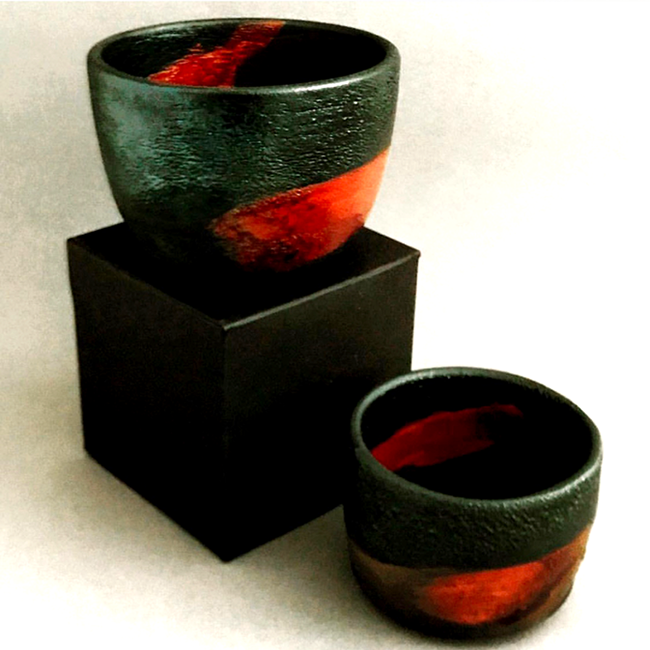 Raku is a traditional type of Japanese pottery. The kiln is heated very fast and the work is removed when red hot. It is then quickly immersed in a combustible material to create crackles in the glaze, bright colours and metallic flashes.