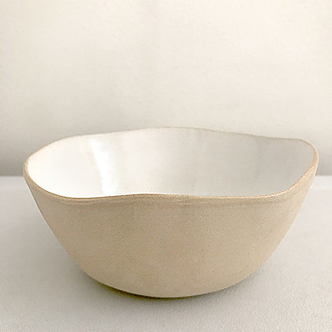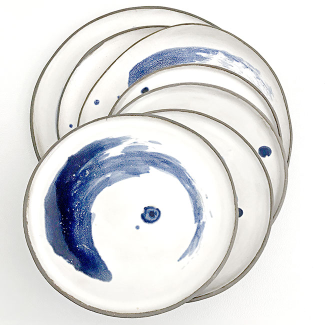 Pieces include large fruit and salad bowls, serving platters, dinner and side plates and bowls. Stoneware, dark and flecked clay are glazed with simple blue and white.