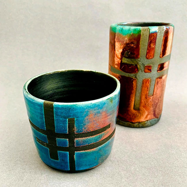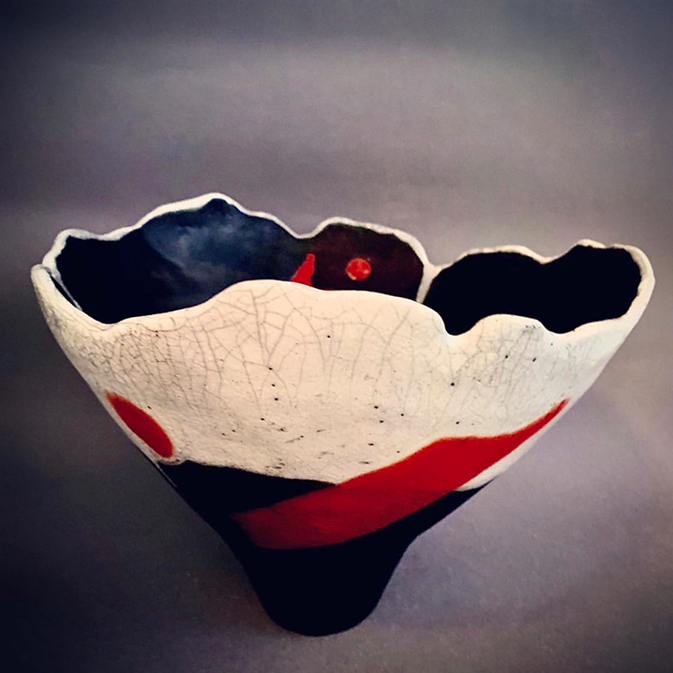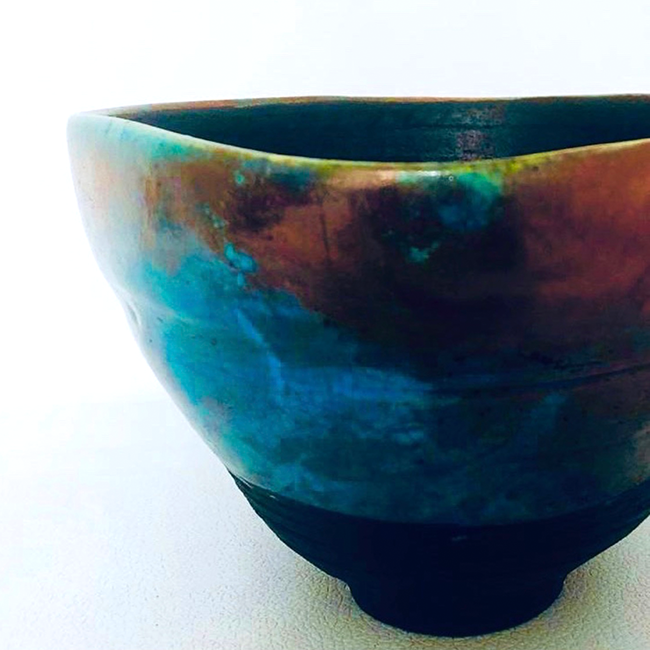 Raku is a traditional type of Japanese pottery. The kiln is heated very fast and the work is removed when red hot. It is then quickly immersed in a combustible material to create crackles in the glaze, bright colours and metallic flashes.
